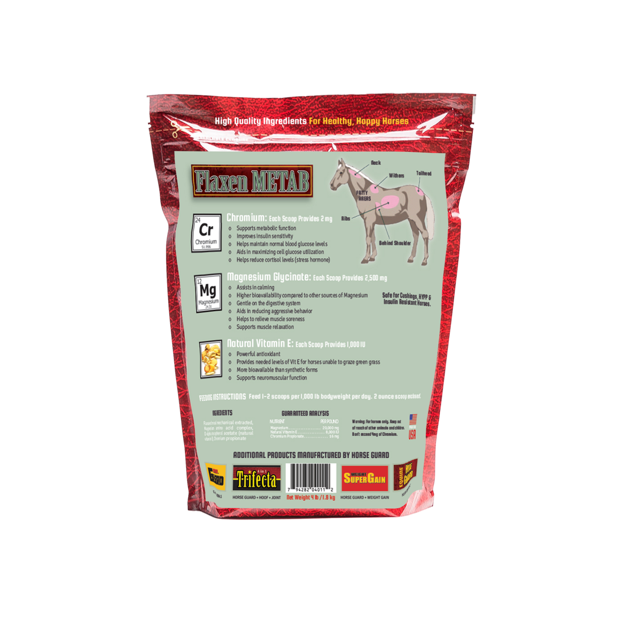 Metab is a premium equine supplement designed to support metabolic health, muscle function, and overall performance. Each scoop delivers 2 mg of Chromium to enhance insulin sensitivity, maintain healthy blood glucose levels, improve glucose utilization, and help reduce cortisol (stress hormone); 2,500 mg of highly bioavailable Magnesium Glycinate to promote calm behavior, support muscle relaxation, ease soreness, and be gentle on the digestive system; and 1,000 IU of natural Vitamin E, a powerful antioxidant that supports neuromuscular function and provides essential nutrition for horses without access to fresh pasture. This advanced formula helps horses maintain balance, recover faster, and stay calm, healthy, and ready to perform.